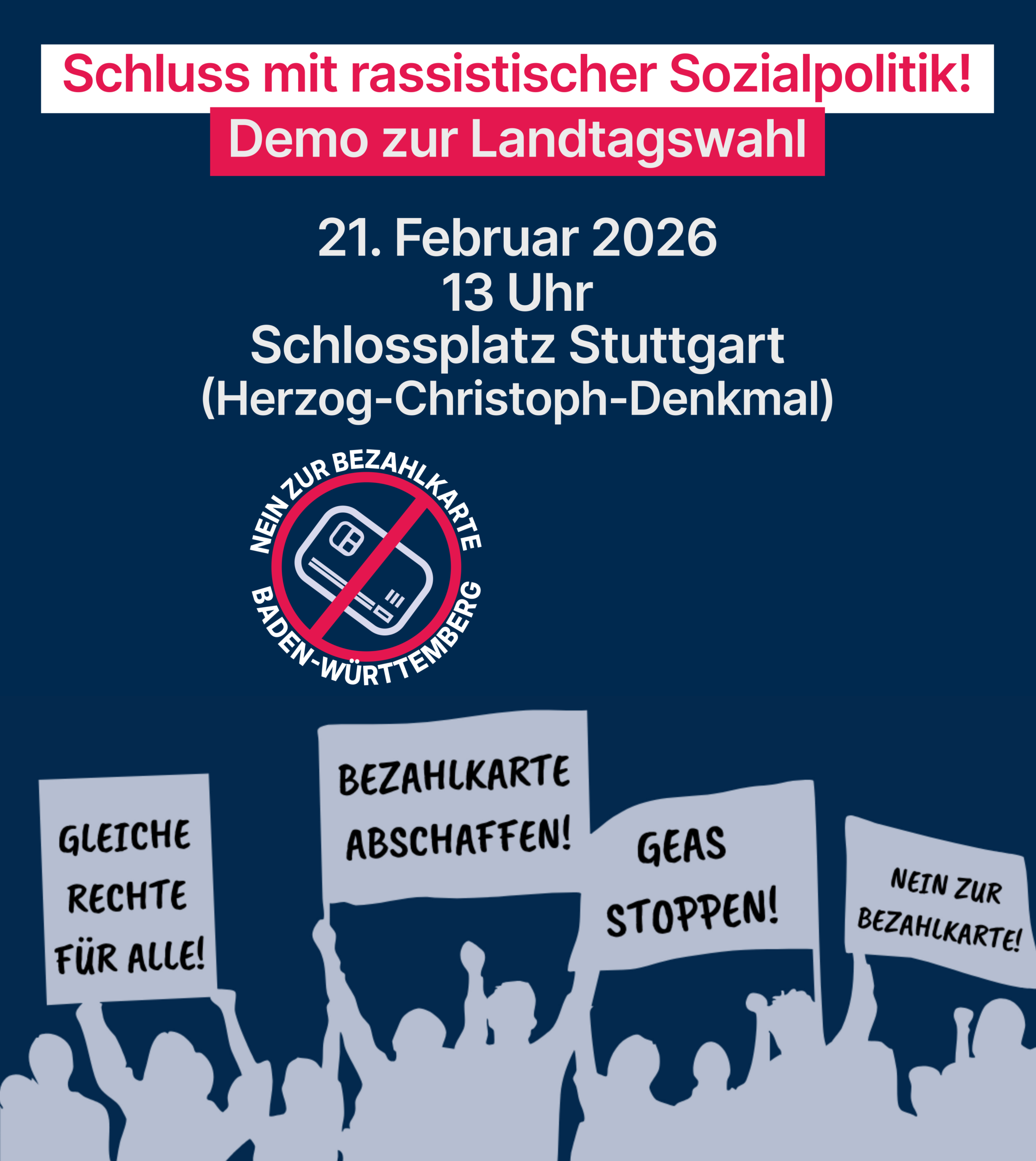 Wir müssen hier mit all unseren politischen Mitteln intervenieren. Informiert euch über die politischen Pläne und verfolgt die aktuellen Diskussionen! Geht mit uns am 21. Februar gemeinsam in Stuttgart auf die Straße und lasst uns vor der Landtagswahl zeigen, dass wir Widerstand leisten!